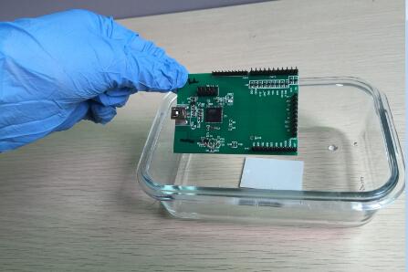(2)倒入適量的TIS-NM納米防潮溶液(即青山新材納米涂層涂料),將PCB板浸入納米液中。